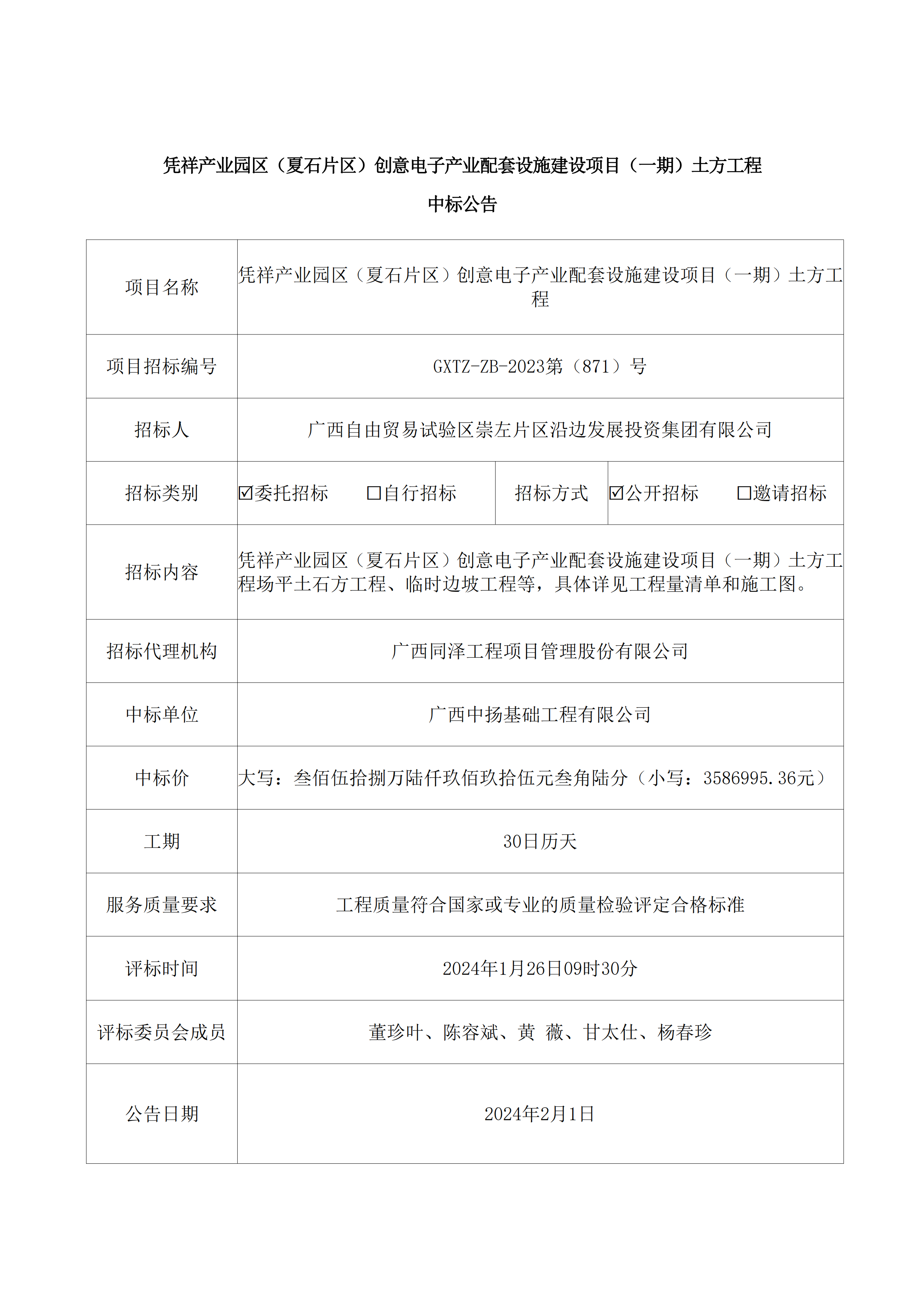 憑祥產業園區(夏石片區)創意電子產業配套設施建設項目(一期)土方工程中標公告