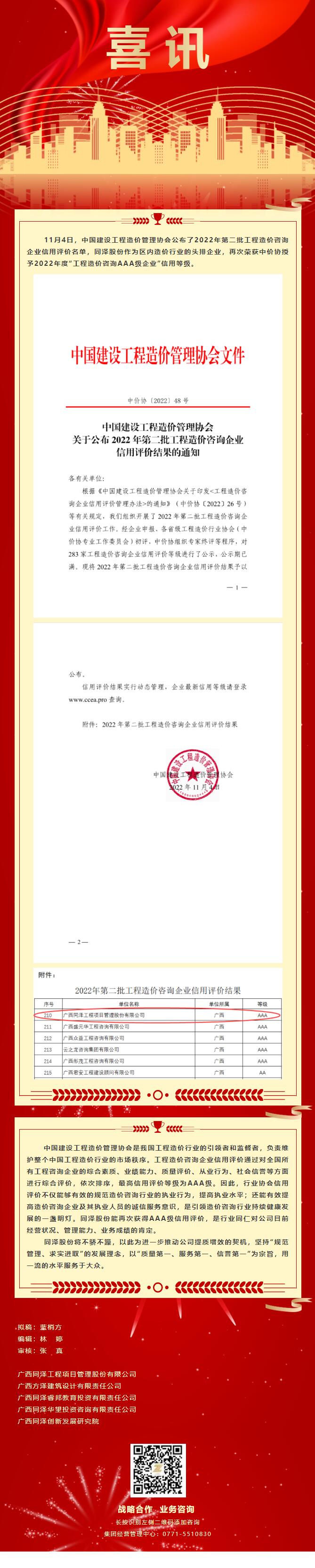 喜訊丨同澤股份榮獲中價協授予2022年度“工程造價咨詢AAA級企業”信用等級